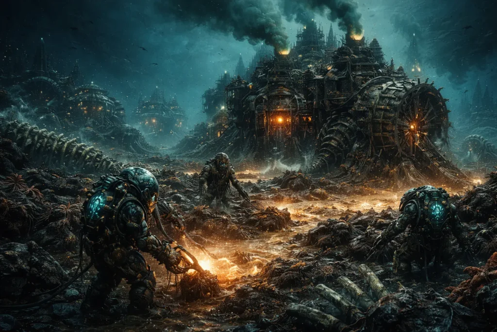 Extraction in the Dead Zones. Churning through the viscous, thermal-rich mud of Tit ha-Yaven, magitek rigs harvest the “baseline of survival”—a resource tied to pre-Deluge scars and now the center of a desperate, undersea war. Credit: Kenomitian