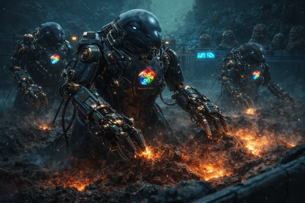 The Golem Shift. Hadit Industries automata displace local Therian labor in the mud beds, marking the transition from civic governance to cold, megacorporate “crisis contracting.” Credit: Kenomitia