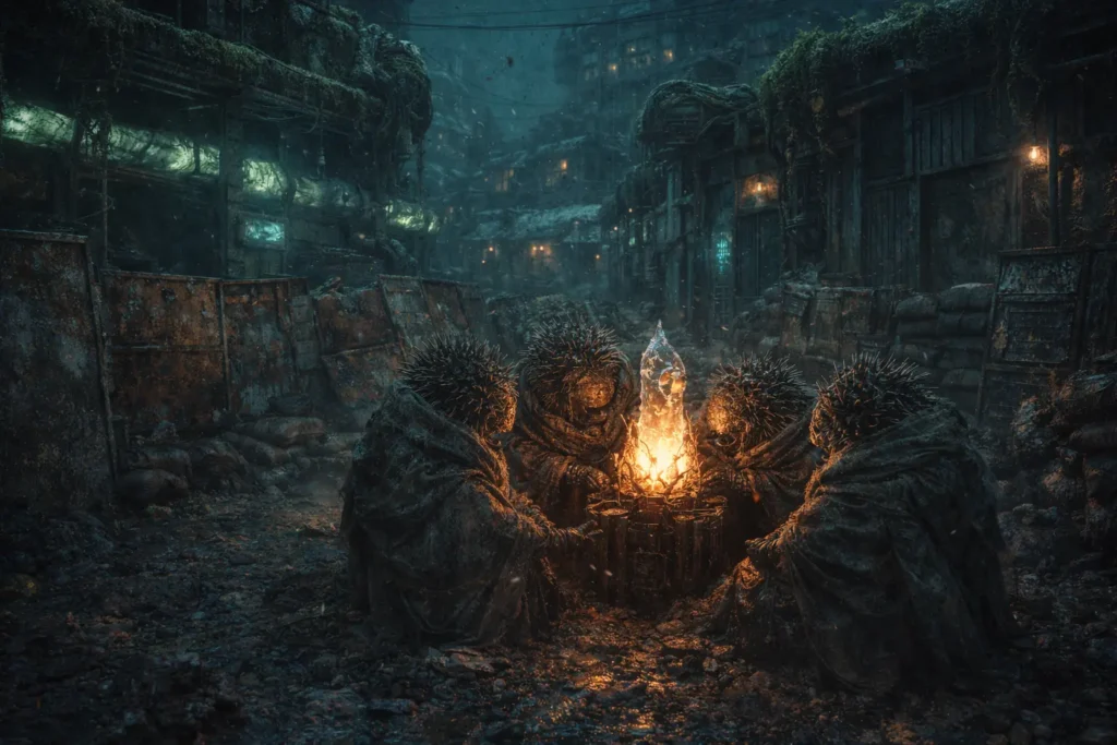 Survival at the Edge. In the bunkerized alleys of the Hallowed Courts, citizens huddle around failing Ramiel heaters—a grim testament to a civilization where warmth is no longer a right, but a dwindling luxury. Credit: Kenomitian