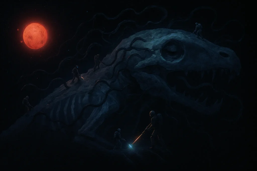 The cadavers of creation, the Ylidheem, are stripped for meteoric iron and “moon rocks,” raising questions about the very fabric of the cosmos (Credit: Kenomitian)