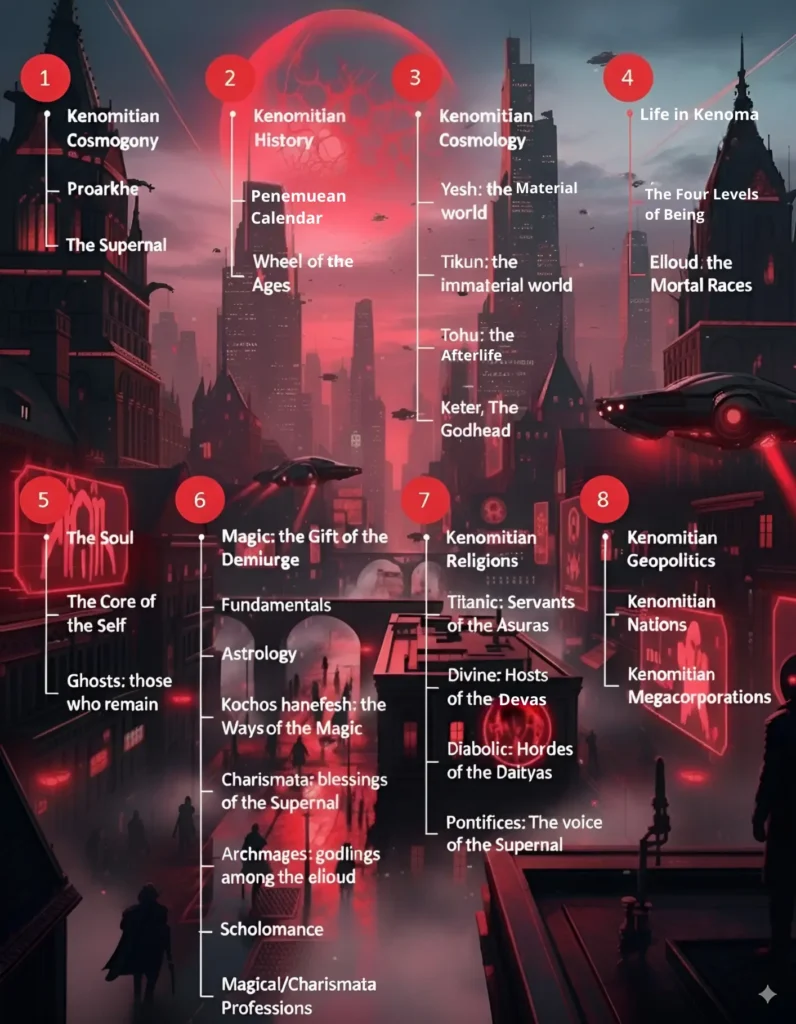 This Compendium is the primary source of knowledge regarding Kenomitian cosmogony, history, cosmology, lifeforms, souls, magic, religions and geopolitics. It covers its Creation Myth, its pantheons, its billions of years of history, its often-melding planes of existence, its afterlife, its lifeforms (including sapient species and multiple bestiaries), its concept of the “Soul” and the undead; and the laws, ways and applications of Magic. It also includes extensive information on its religions, nations and megacorporations. All in all, it is the quintessential sourcebook.