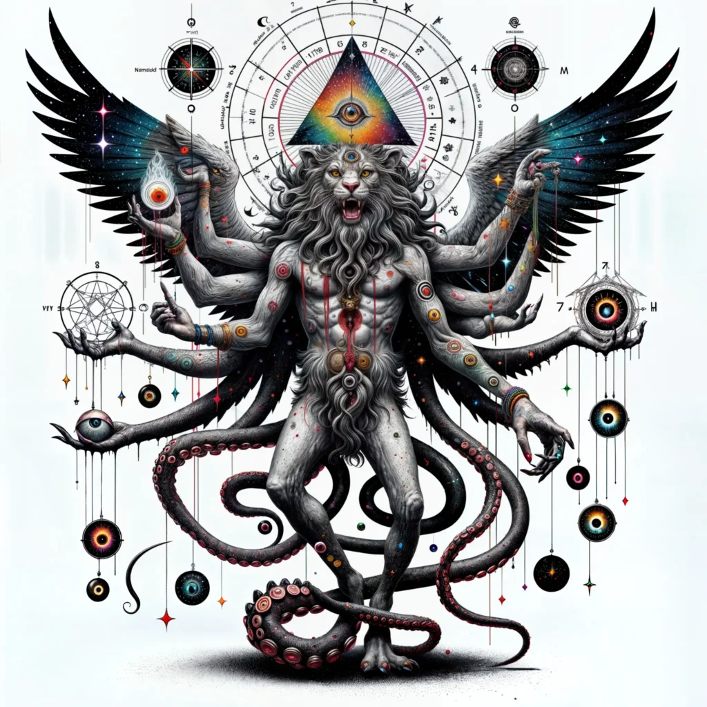 Abraxas, the hermaphroditic Aetheric Demiurge, bears titles like the One, Sustainer, Almighty, and Grand Architect. Mundanely, it is everything; supernaturally, an androgynous ultraorganism of Aether with a three-eyed, saber-toothed lion’s head beneath a bloody pyramidal hat, upheld by ten thousand geometric wings.