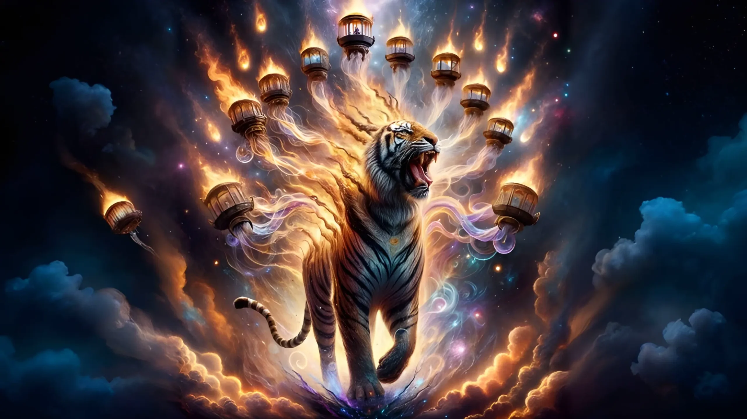 Merkavah, Energy’s Vessel (Female)—also called Quintessence and Diamond Thunderbolt—is the Guardian of the West. Mundanely she is energy itself; supernaturally, an ultraorganic paper tigress forever scorched and remade by crackling bursts, ringed by seven glass chariots. Her temperament flips between a drowsy, submissive courtesan and a frenetic, comedic, distractible speed freak. In the Darkness Between the Stars, her idol unpredictably radiates waves of scorching heat or freezing cold.