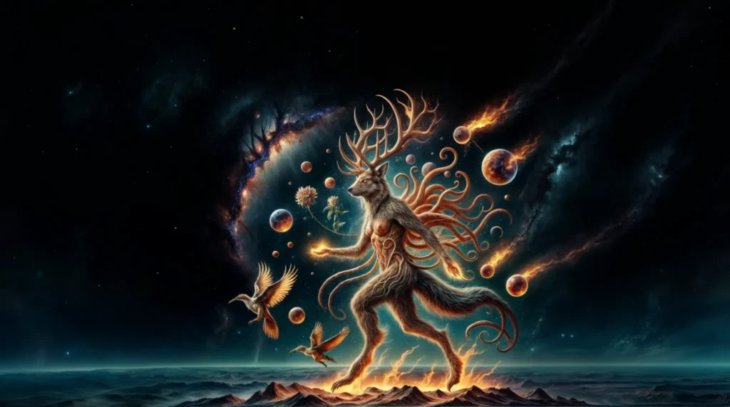 Gashmi, the Odic Flame (Female)—also called Abiogenesis, the Golden Bough, the Burning Bush, and Guardian of the Southeast—embodies suns. To the supernatural eye she’s a flaming walking tree, an ultraorganic fusion of elk, mustelid, cuttlefish, and cuckoo, orbited by seven blood orbs and trailing life-sparking ash. Cheerful and enamored of beauty in all non-Diabolic beings, she is physically attracted to every hayyoth. In the Darkness Between the Stars, her idol induces aphrodisiac effects in all onlookers.