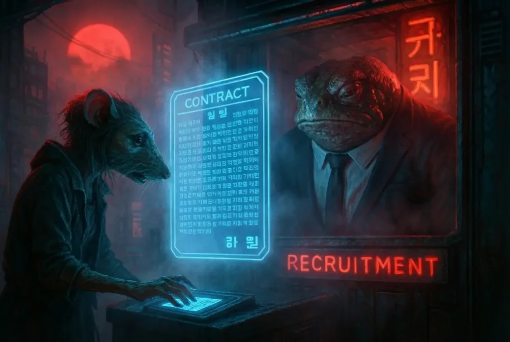 The market for desperation: signing the “voluntary slavery” contract—the life-altering choice between debt relief and permanent personhood transfer (Credit: Kenomitian)