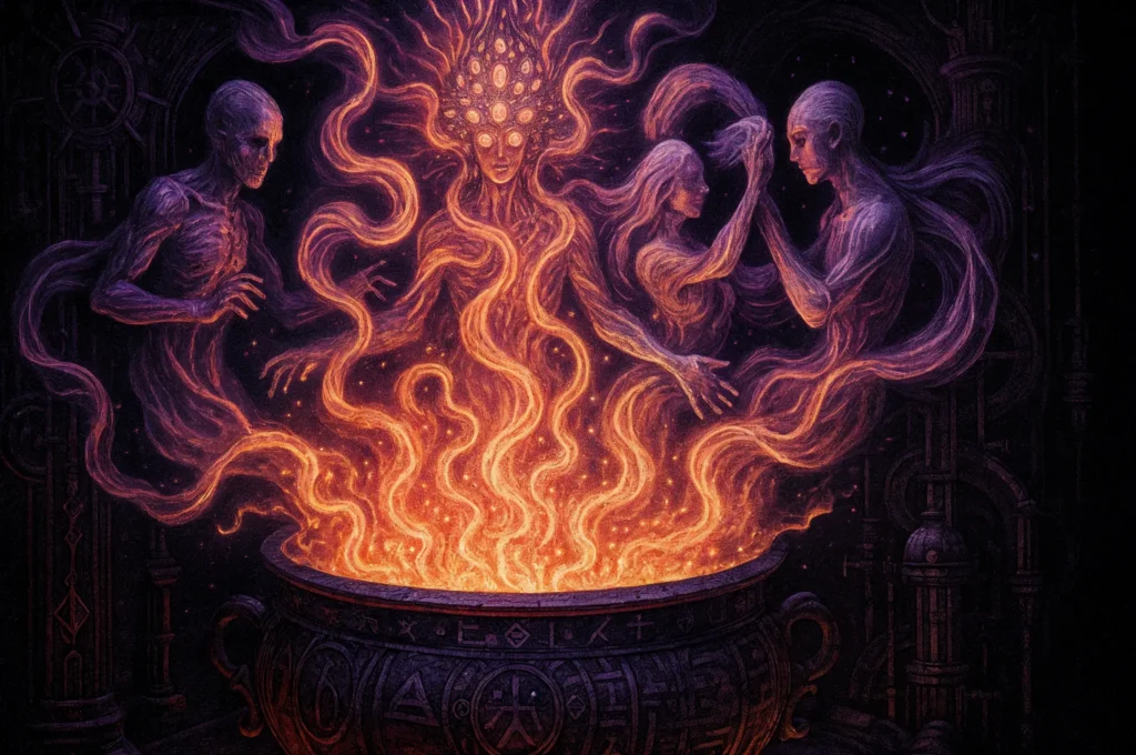 It poured Aether in Ayin’s amniotic fluid, and mixed it with the Prosopon of the Shi’ur Qomah: the celestial concert of Akudim, Nekudim and Berudim; the keys to Merkavah and Hekhal; the antithetical bond between Ein Sof and Rachabh; and the vital warmth of Gashmi. It arranged the ingredients in a tetramorph and cooked them in a cauldron of radiation over the course of an Age, until they coalesced as the Archons: Atziluth, the Form of the Good; Beri’ah, the Pillar of Mercy; Yetzirah, the Pillar of Severity; and Asiyah, the Red Thread of Fate. Thus ended the Second Age.