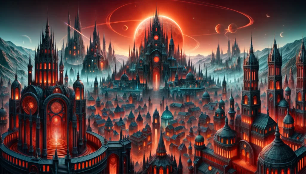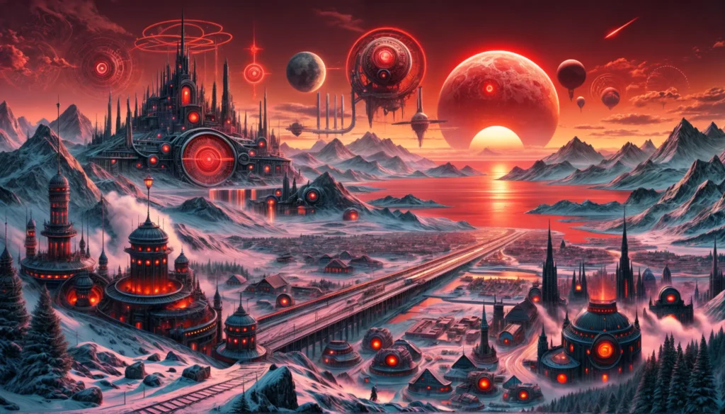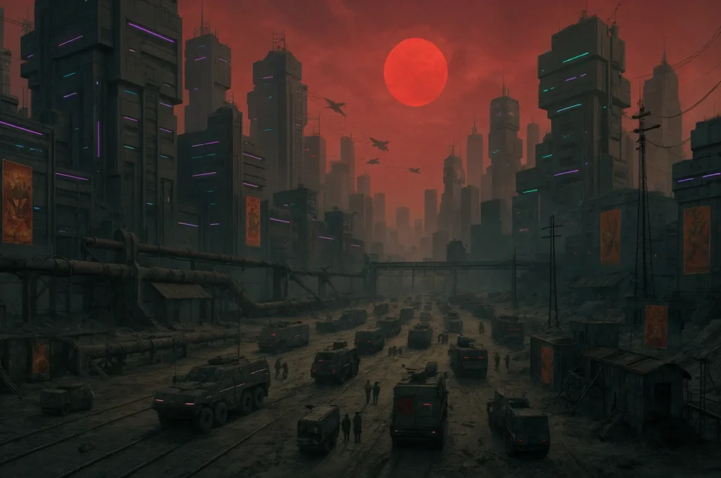 A somber, Cassette Futurist view of Authadia, the capital of the Socialist State of Sabaoth, under the ever-present red sun of the Kenoma system, reflecting the pervasive military mobilization and ideological grip of the regime (Credit: Kenomitian)