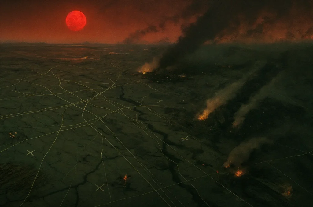 A landscape in Sige, marked by the scars of trench warfare and military transport, with fires from recent conflicts burning under a perpetually red sky (Credit: Kenomitian)