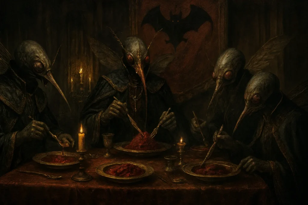 Hematophagy, a cornerstone of Haemus religion, is both a spiritual and culinary tradition in Sophia, with the nation’s black vampire bat emblem symbolizing its importance (Credit: Kenomitian)