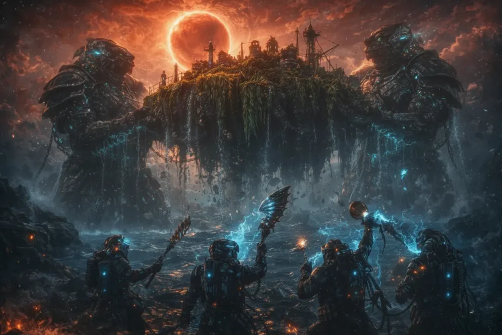 “Whirlpool” placed the League’s military doctrine on stage. Soldiers donned waterproof command headsets and woke newly forged golems [2], each powered by pitch-black Mana. The target was a submerged artificial island chained to the seafloor. As golems pulled, teams responded with ritualized music that magically fed them. Rhythm mattered more than volume: an instructor beat the gunwale with a shark-tooth club, keeping time as commands came clipped and simple. “Shoulder. Breathe. Heave.” Every syllable carved space in which to think.