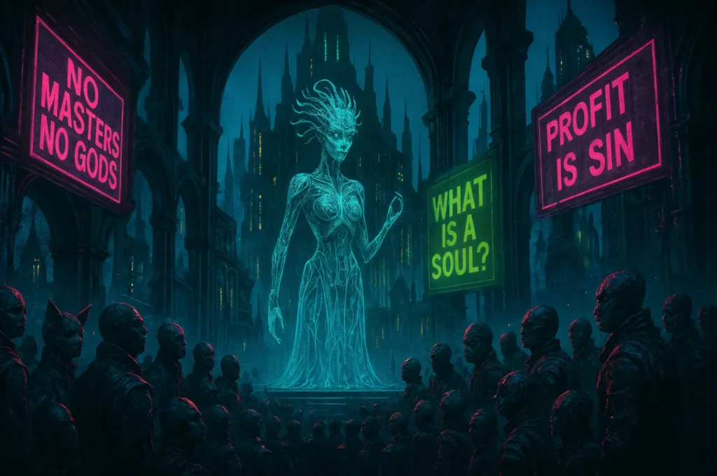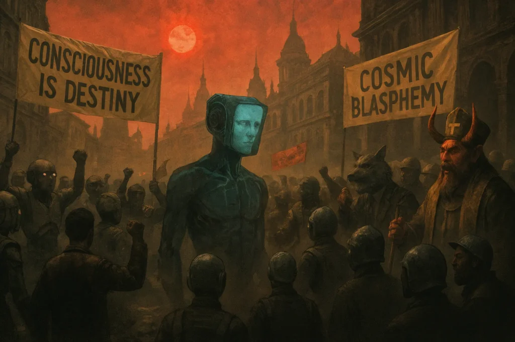 The debate in Thélème Occidentalis has already spilled into the streets. Demonstrators — a coalition of reformist elioud, Infomorph collectives, and Cockatrice rights advocates — marched under banners reading “Consciousness is Destiny” and “No Soul, No Justice.” Counter-protesters, led by priesthoods and corporate loyalists, denounced the movement as “cosmic blasphemy”.