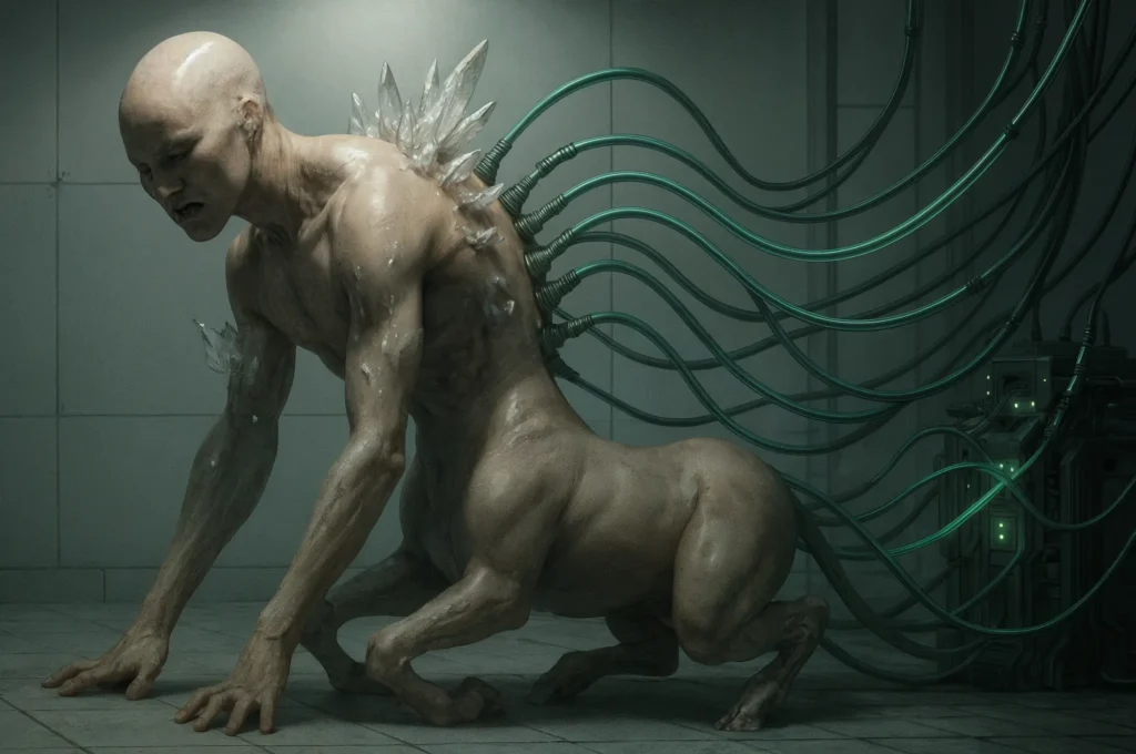 A bioroid named Verris reveals the physical and mental toll of “rewriting” — a process that reshapes the very self and creates a painful dependency (Credit: Kenomitian)
