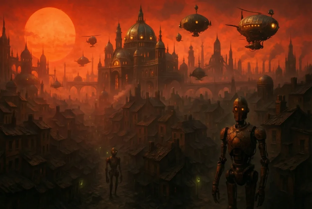 Golgonooza styled itself the jewel of Albion’s Neo-Victorian renaissance. Airships hemmed the sky, and velvet uniforms patrolled boulevards named for order and industry. Yet a contiguous maze of tenements festered in the shadow of jeweled domes.