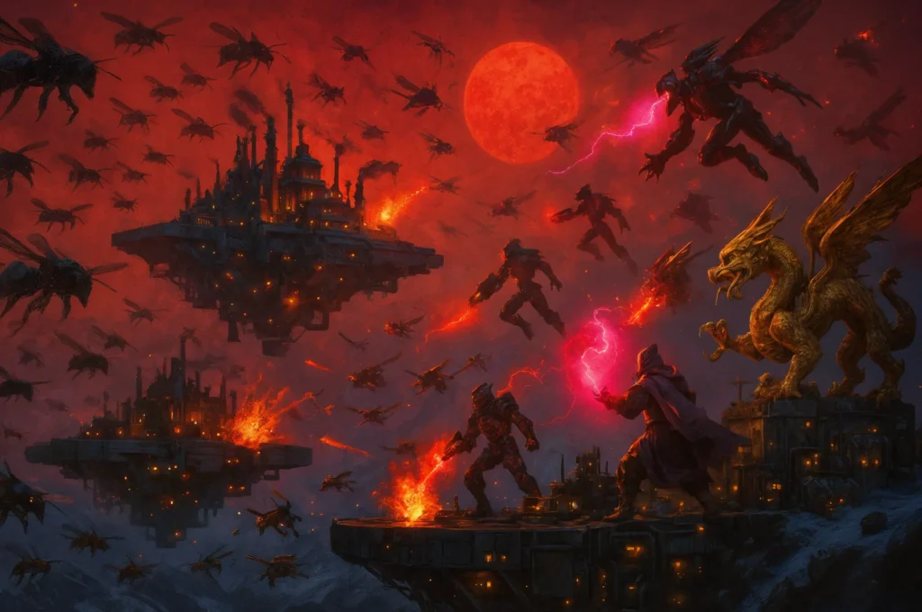Over the floating Zhang Guolao landmasses, a costly aerial battle rages. The devastating Asrestar swarms of the Abbā də Rabbūṯā meet their match against Zalgo’s disciplined air defenses and the unwavering resolve of the Guo Long Warrior Order (Credit: Kenomitian)