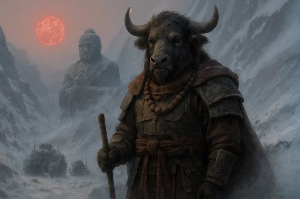 Reports from the Prajñā prefecture speak to the quiet resolve of the Nousian people. A veteran, Kelsang, recounted: ‘Their machines break where our spirit does not.’ His words, a testament to spiritual resilience, highlight the fierce resistance in the high-altitude conflict (Credit: Kenomitian)
