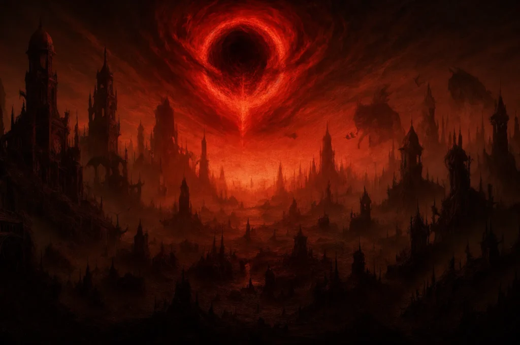 Zion’s skies darken, not by nature, but by the insidious touch of ancient evil. Famine and decay spread, signaling a cosmic punishment now actualizing itself across our dimension (Credit: Kenomitian)