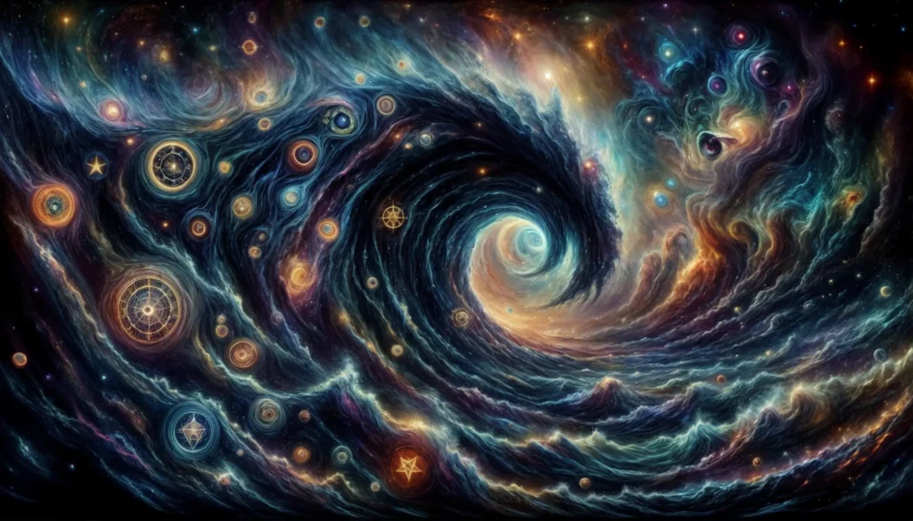 This era continues the cosmic unfolding, beginning with “Archontian Harmony” and the primordial struggle of “Order vs Chaos”. Significant events include “The Birth of the Titans” and their instruction by the Champion, followed by “The Discovery of Orgone and the Crafting of the Avatars”. The era culminates in “The Birth of the Deities,” the calamitous event of The Mashchit, and finally The Shevirat HaKelim, which led to the birth of the Devils, the ascension/descent of the Archons to Tikun/Tohu, and the planting of the foundational Etz Autozoon.