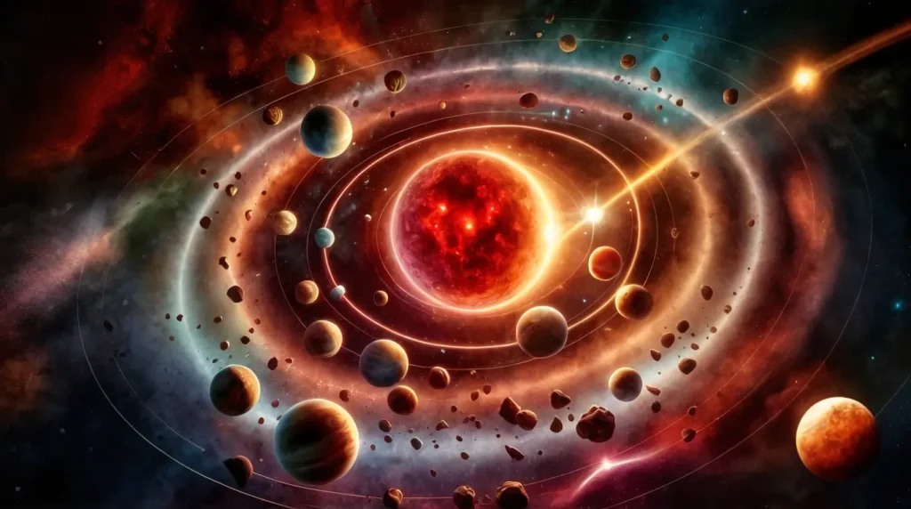 The Red Star Yaldabaoth and its orbiting bodies (Credits: Kenomitian)